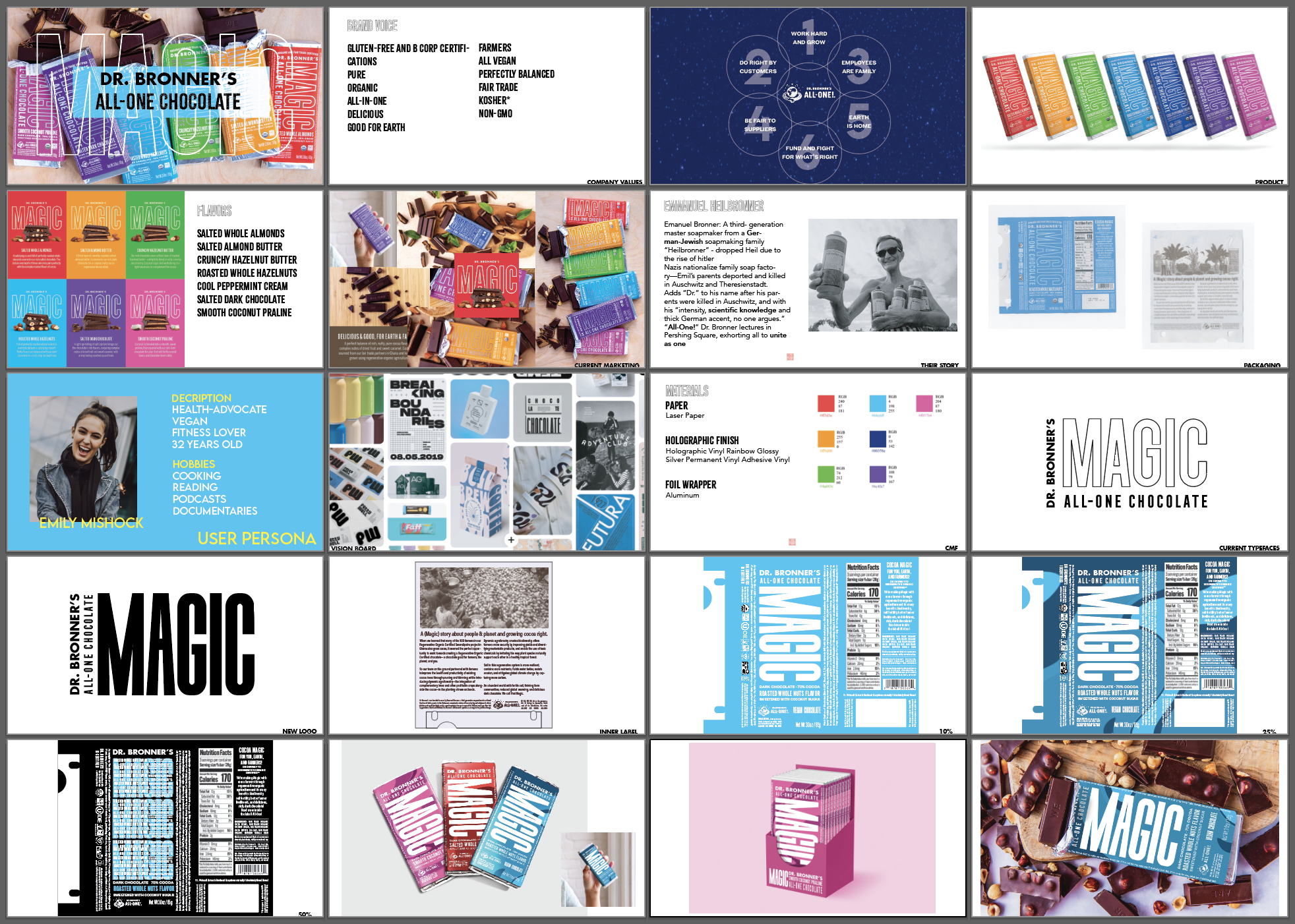 In redesigning Dr. Bronner’s Magic ALL-ONE chocolate bar, I was speaking to health-conscious individuals and vegans. I navigated the challenge of maintaining Dr Bronner’s strong brand identity, known for a type-heavy design, while branching out to a new market of buyers. Testing the redesign potential, I created 3 levels of iteration: 10%, 25% and 50%. Learning to speak the language of a specific customer is vital to creating a design that feels like home.