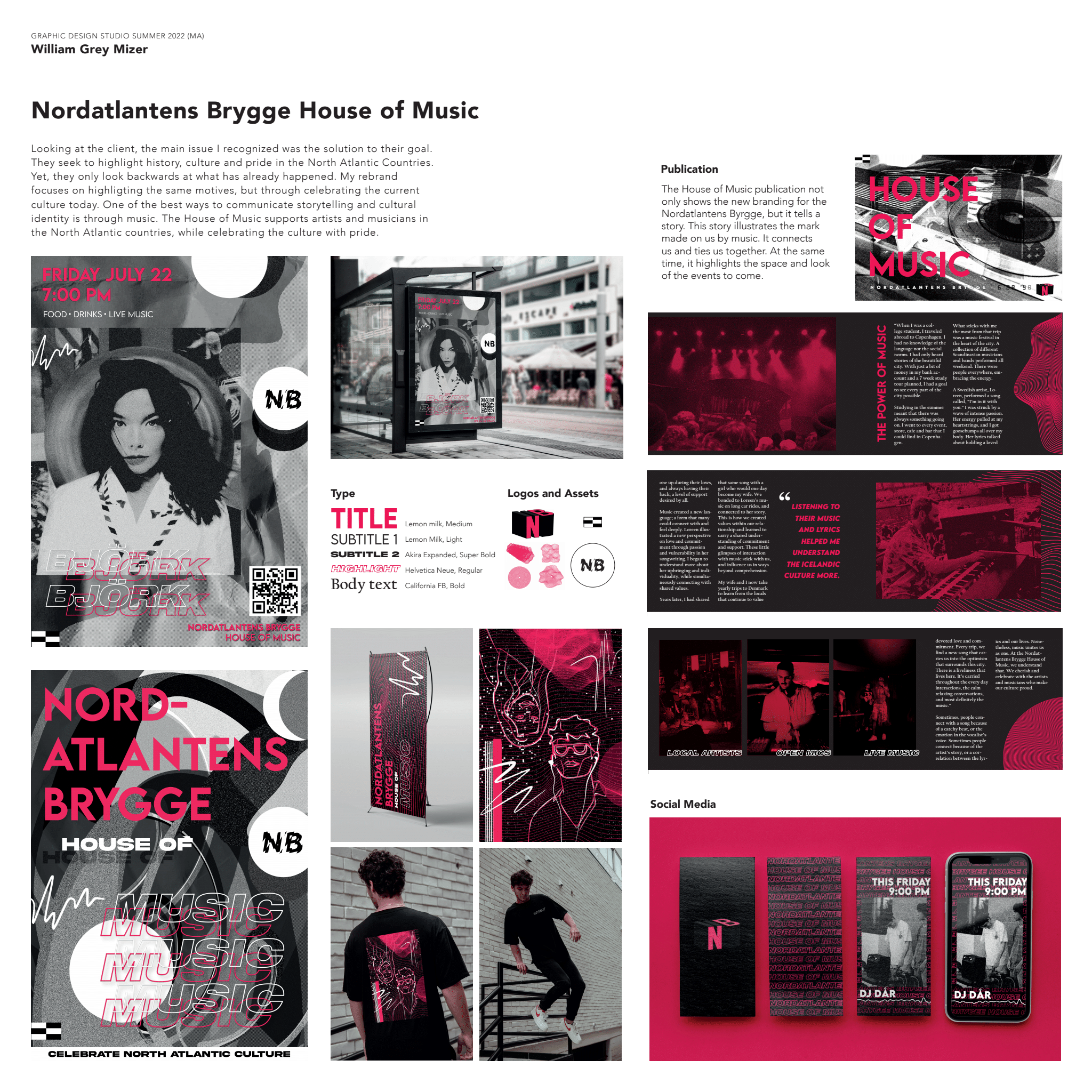 Nordatlantens Brygge, a cultural hub, faced a challenge of primarily looking backward in its mission to showcase North Atlantic history and culture. In response, my rebrand centers on preserving these themes through a contemporary lens. The House of Music supports and celebrates present-day culture through music, ensuring a more relevant connection with the current cultural landscape.
